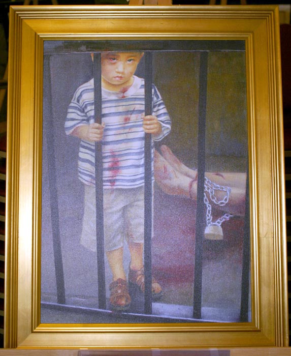 另一幅画—《为什么》,看上去:监狱铁栏杆后面的小男孩,似乎还不到四、五岁,满身伤痕,他那悲伤的目光透露着疑惑;他的背后是躺在地上,被锁着脚镣,也布满伤痕的妈妈。观画后,不禁让人们也发出同样的疑问—“为什么警察要打我的妈妈和我?”是啊,究竟是为了什么?