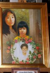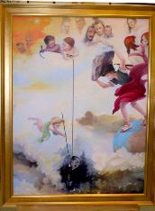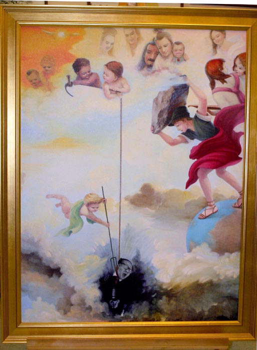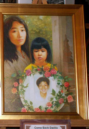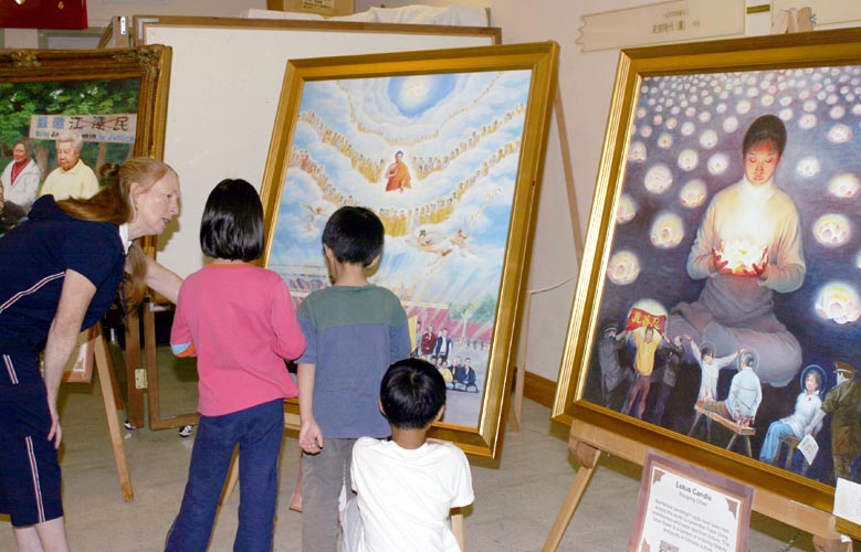 其中一幅油画—《爸爸回来吧》,体现的是:小法度—她的爸爸因为修炼法轮功被中共迫害致死,几年来,她跟着妈妈走遍了世界许多地方,向人们讲述爸爸的遭遇。看着画,令记者感受到:小法度的呼喊—“爸爸回来吧!”;妈妈告诉小法度:“在中国,还有不少人象爸爸那样,受到迫害,却没有人知道。”