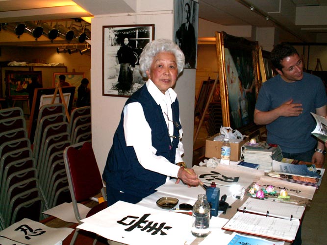 在接待桌前有一位老人,她叫曾陈美荷,是一位缅甸华侨,今年已有85岁高龄,出身书香门第,从小受过良好的中国书法训练。她高兴的告诉记者,在女儿的帮助下,最近一段时间认真修炼法轮功,她那原本驼着的背,又直了起来。这次,她是特意来为画展出力,重操笔墨为观画者免费题字留念。