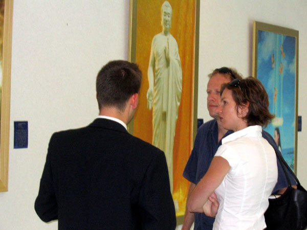 一位议会里的资深官员,独自一人仔细、认真的观看每幅作品,看完后郑重的走向画展工作人员,他说:“真诚的感谢你们把这么纯正的、美好的艺术品在此展览,非常希望能为画展做些什么。”最后他在留言簿上写到:“真理必胜!”
