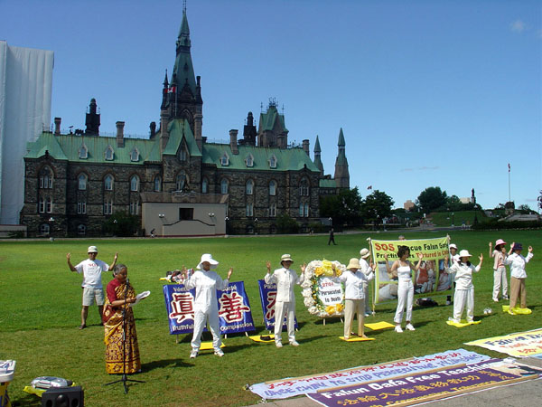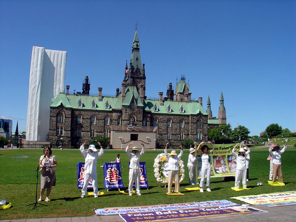 在人潮涌动的国会山前,草坪上一些身着白色的法轮功学员静静的打坐炼功,另一些则向过往的游客介绍法轮功,讲解真象。