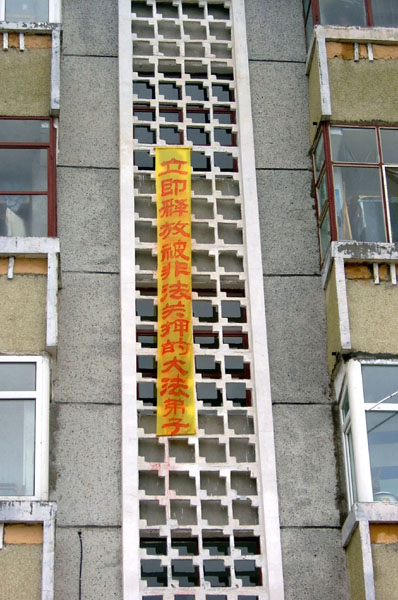 【明慧网2005年7月22日】7月21日黑龙江省大庆市大法弟子在某繁华地区、楼区展现了正法条幅,经连宵风雨肆虐后的条幅,更显光彩,“法轮大法好”的条幅愈加清晰耀目。