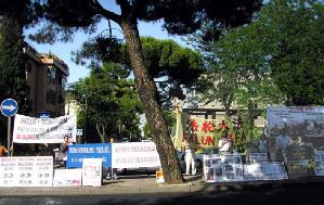 中使馆前过往车辆川流不息。在红灯时,停下来的车辆纷纷拉下车窗向学员招手索要传单;而绿灯时,行驶中的车虽然不能停下来,但都放慢了车速从法轮功学员的请愿队伍前慢慢驶过,有的则鸣笛声援这群和平的抗议者。