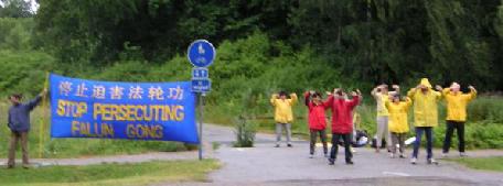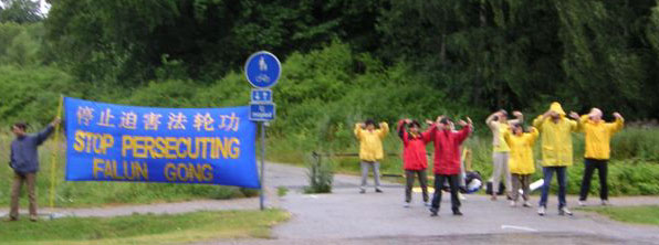 【明慧网2005年7月23日】2005年7月20日清晨,瑞典斯德哥尔摩一反夏日的温暖,寒风夹着阴雨。中使馆前,部份瑞典、突尼斯、乌克兰的法轮功学员坚持炼功、发正念,呼吁制止已持续了六年的对法轮功的