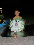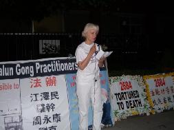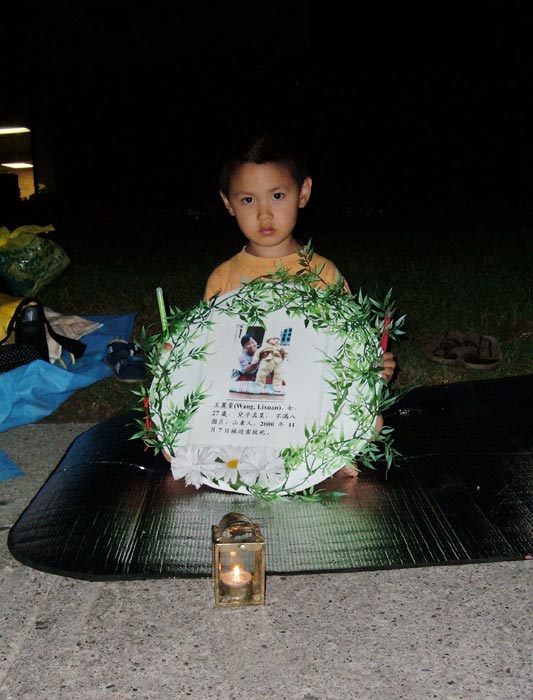 ![]() 3岁的成成手捧遗照 | ![]() 西人法轮功学员代表讲话 |