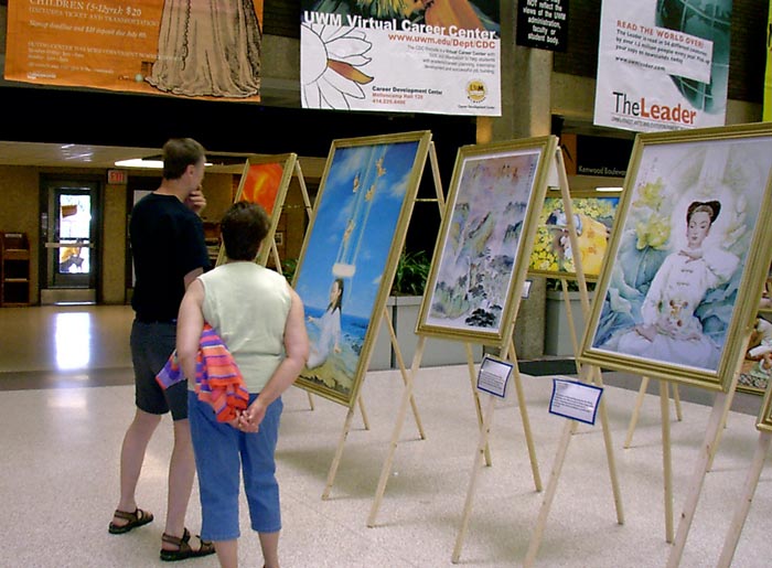 举办画展前,我们把有关的消息放到属于亚洲研究系的邮箱里。我们注意到许多前来参观的中国人把这次画展与过去在校园里举办的其它展览作比较。他们对中共的评价好坏参半,但对法轮功的印象也有好有坏。我们善意的向他们讲解作品,并且心怀善念的告诉他们中共是如何利用国家宣传机器来诬蔑法轮功,欺骗中国民众的。我们能感受到这些受蒙骗的中国人的心开始动了。这个画展的确为我们揭露邪恶和讲清真象带来了契机。