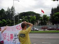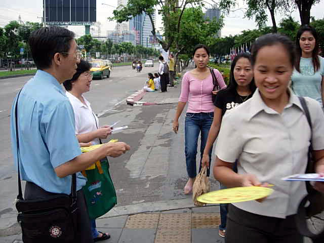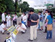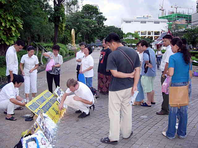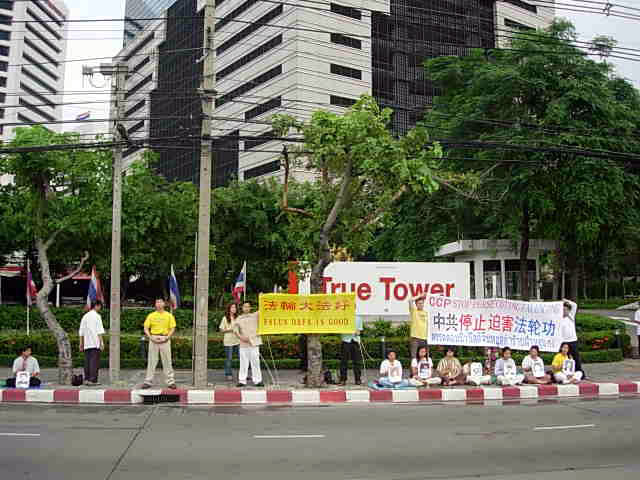 自1999年7月20日,江泽民集团发动了对法轮功的迫害,迄今已长达六年。为表达对被摧残致死的两千多位中国法轮功学员的哀思和对同修的声援,泰国法轮功学员于7月23日下午五点左右,带着横幅、真象展板、花圈、烛盏等聚集到中使馆前,向人们展示法轮功在中国遭迫害真象,呼吁人们共同努力制止镇压。