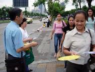 学员们同时还向前来的泰国警察洪法,介绍在中国发生的事情。警察说:“我们是来帮助你们维持秩序的,只要你们没有妨碍交通,你们可以来,这是你们的权利。”