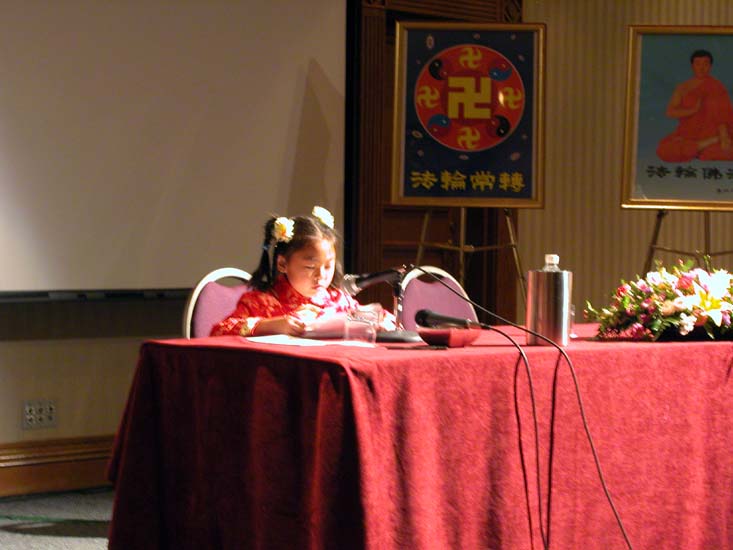 近10名小弟子用中文或英文,宣读了他们的修炼心得文章。无论年龄大小,大家在交流中都谈到,学了法轮大法后,很多执著去掉了,心性提高了。比如有的小朋友在学校被同学欺负,或者在家里与兄弟姐妹有冲突时,就会想起师父说的话,按修炼人的标准要求自己,努力做到善和忍耐,也就不生气了。许多小弟子也谈到了自己怎样排除干扰向其他人讲真象和洪法。小弟子们努力按“真善忍”修炼,“真善忍”的法理在纯净着他们的心灵。