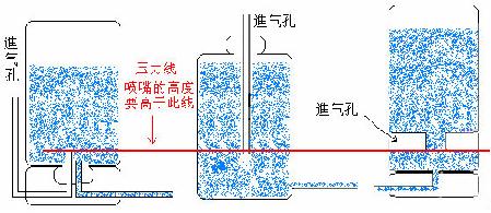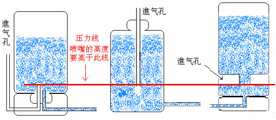 外接瓶的设计主要是要做到,瓶子里墨水对外的压力不应因瓶内墨水的多少而变化。图中三种方式压力都应是从红线开始计算的,市场上卖的各种型号的连供也应该遵循上述原则,我也见过不符合上述原则的连供,这样的连供不要买。我现在认为不管什么机器,灌墨管从進气口進,然后封死,外接瓶的進气口的高度(即上图红线的高度)不要高过喷嘴(也不是特别的严格,可以有一个范围),不管什么机器都应该能成功使用连供。具体制作请参见明慧7月2日文章《制作简单的佳能连续供墨系统和最简易的灌墨方法》(https://pkg2.d2s3ombhnov3zf.cloudfront.net/mh/2005/7/1/inksystem-doc.zip)一文。