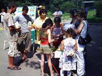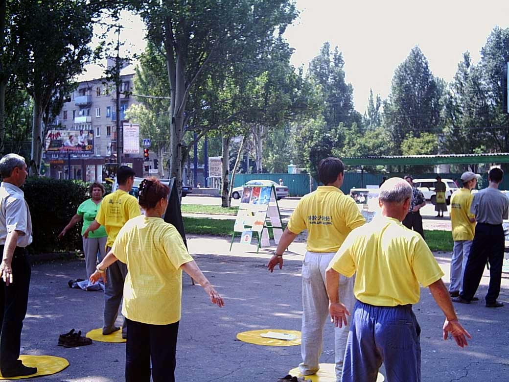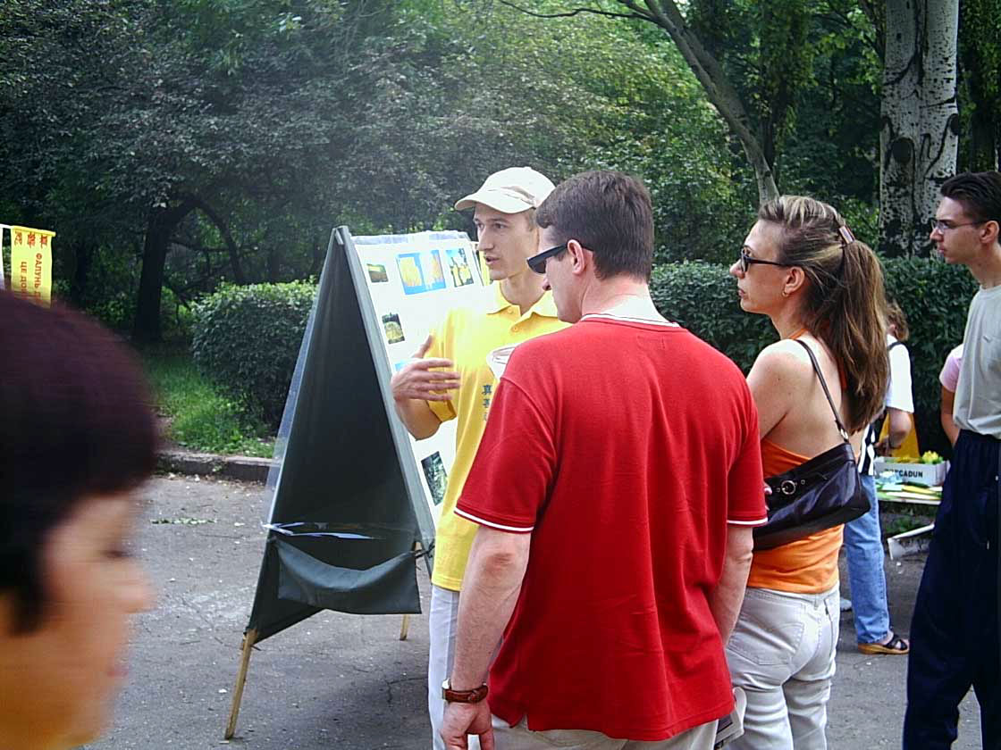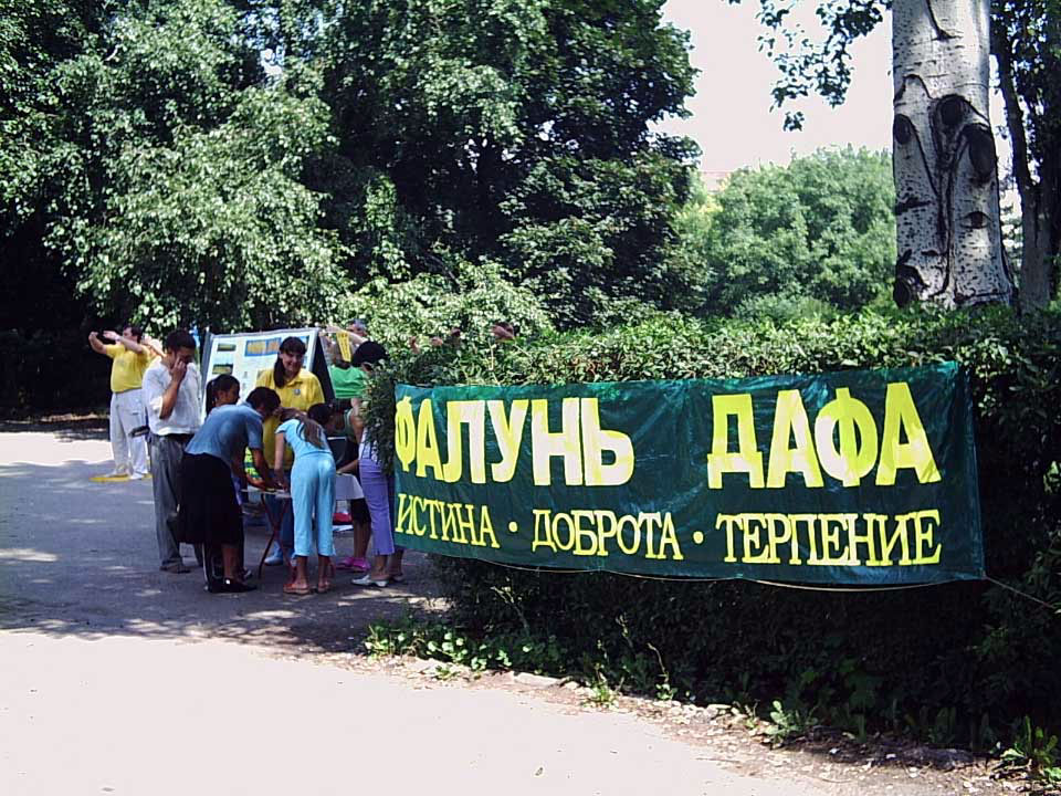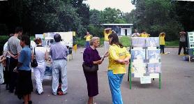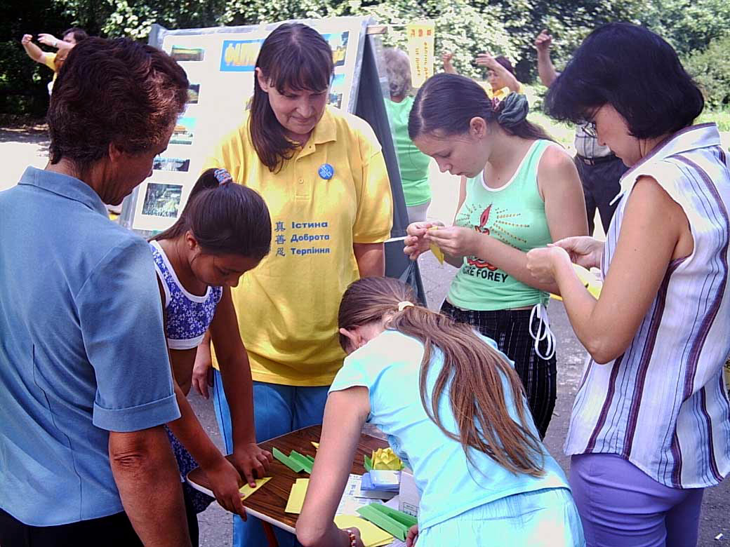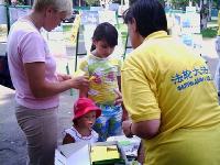 活动期间法轮功学员一起集体炼功并展出了部份国际“真、善、忍”画展和大法洪传世界内容的图片。学员们还组织了声援法轮大法弟子遗孤的叠纸莲花活动。