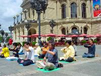 宽阔平坦的老歌剧院广场上,明亮的阳光伴随着清凉的微风,人们从容而悠闲的漫步着,年轻的男女风一般骑着各式跑车,体验着自由的感觉。来自附近城市的十几位法轮功学员在静静的演示着功法,展示着酷刑后血肉模糊的照片。