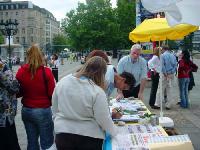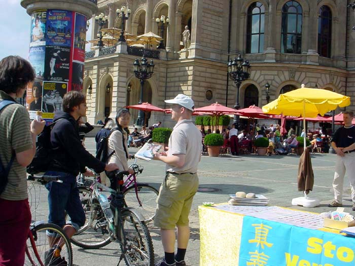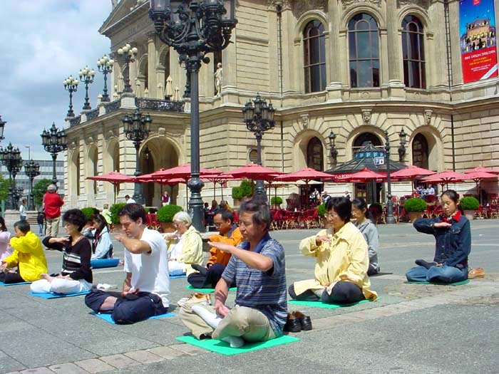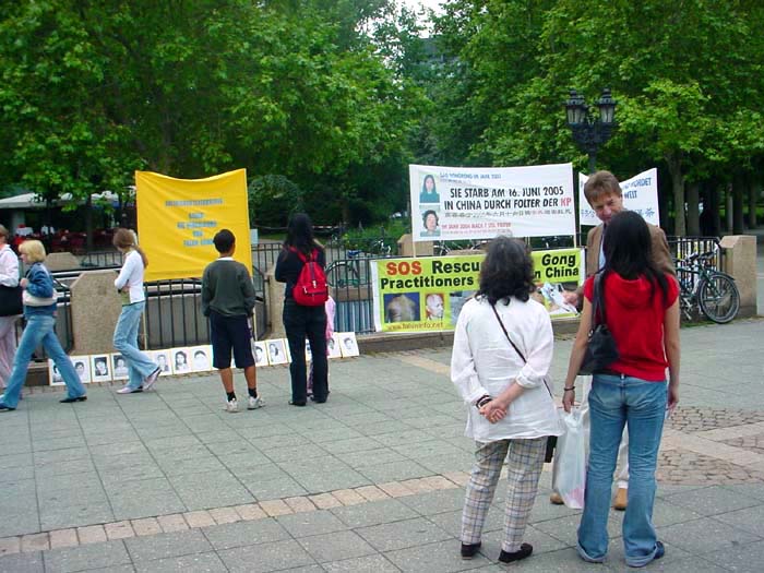2005年7月23日,星期六,在德国国际金融中心法兰克福市老歌剧院前,由法轮功学员举办的“7•20”六周年,呼吁制止迫害的活动中,记者找到了答案。