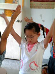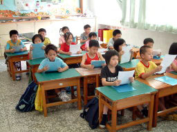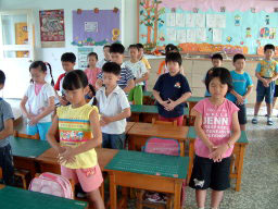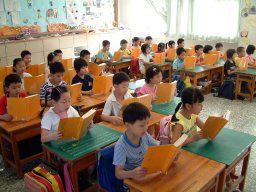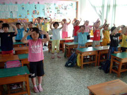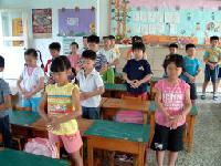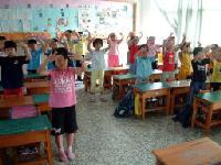 第一个学期,每天学法炼功。一开始,我担心二年级的小朋友识字不多,所以我读一句,他们跟一句,没几天我发现我的顾虑是多余的。于是每天早上七点五十分,我们先炼一套功法,接着一起学法,孩子们学法时的专注神情及进度,处处都让我觉得吃惊不已。当遇到每周两次的教师晨会,我就请学校两位六年级的法轮功小弟子来陪孩子们炼功。开完会之后,立刻回到教室跟他们一起学法。第一学期如期在学期结束前,读完一遍《转法轮》,其中穿插着背诵《洪吟》。