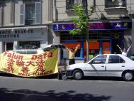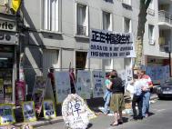 学员们在中领馆前打开“法轮大法、真善忍”、“正在中国发生的……”等横幅,摆放揭露迫害真象的展板、悼念同修的花圈等,不停播放录音用中法文轮换向前来中领馆申请签证或办理护照的人们呼吁:关注法轮功在中国遭迫害真象,共同努力制止迫害!