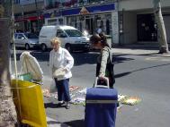 有很多的申请签证或办理护照的人们等在中领馆门前,看到对面法轮功学员悬挂的横幅、摆放的图片时久久注视、议论纷纷。这时法轮功学员拿了一叠真象资料向他们走去,从头到尾挨个询问、发送中法文法轮功真象,人们高兴的接受,有的法国人在接受真象时还用中文说:“谢谢!”学员则微笑着回答:“Je vous en prie(不客气)”!