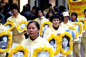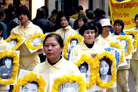 报道并配以法轮功学员手捧被迫害致死的法轮功学员的照片。报道说来自汉密尔顿80岁的法轮功学员,手中捧着被迫害致死女士的遗照,照片中的女士因信仰法轮功被中共迫害致死。游行中很多人拿着被迫害致死者的照片。