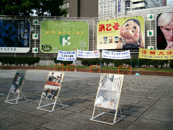 荣广场公园,位于名古屋市中区最繁华的地段,公园周围办公楼、各种商店林立,从早到晚车水马龙、人来人往。法轮功学员们一早就在公园里摆上介绍法轮大法洪传世界与揭露中共迫害法轮功的真象图片展板,并打出了“法轮大法好”、“真善忍”、“停止迫害法轮功”等横幅,这些横幅十分醒目,四面八方的过往车辆与行人从很远的地方就可以看见。