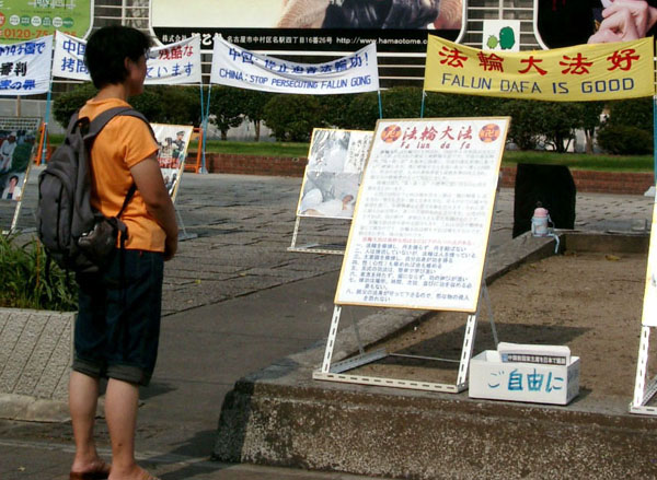 中午12点多,一位看起来40多岁的华人女士带着两个10几岁的男孩儿主动来了解真象。她问:“法轮功到底是怎么回事呀?”以及中国为什么镇压法轮功等问题。于是法轮功学员告诉她:法轮功完全不象中共诬蔑的那样。法轮功教人“真善忍”,做一个好人,现在已洪传世界70多个国家和地区,很多西方人也都在炼。在中国大陆只是因为炼功的人数太多、超过了中国共产党的党员人数,前中共头子江泽民出于妒嫉,于6年前发动了对信仰“真善忍”的善良老百姓的迫害,现在已被包括日本在内的世界上15个国家的法轮功学员以“群体灭绝罪”、“酷刑罪”、“反人类罪”等多种罪名起诉……这位女士说她来日本18年了,现在住在东京,是特意来看世博会的。前一天参观了世博会,今天到名古屋市内看一看。正好路过这里,就来问一问。
