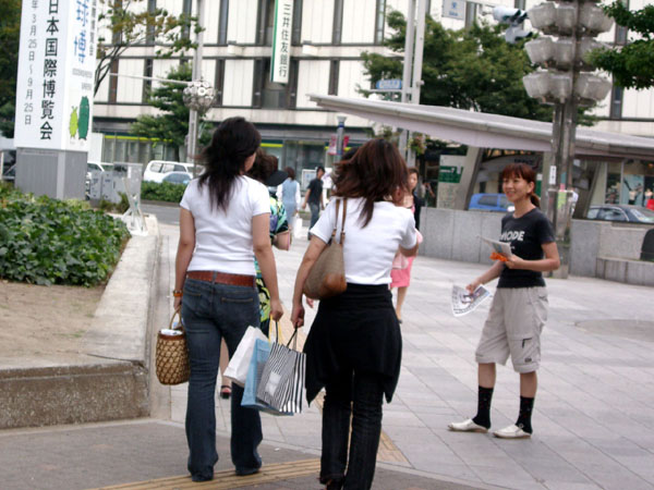 由于现在正在名古屋市附近举办“2005年日本国际博览会”(日文的爱称为:“爱•地球博”,截止到7月19日,世博会的入场人数已达1178万8426人),名古屋的大街上到处都可以看到有关世博会的宣传品,当然,在过往的行人中、在来了解真象的人们当中就有许多是特意来参加世博会的。