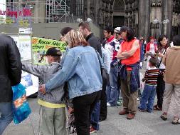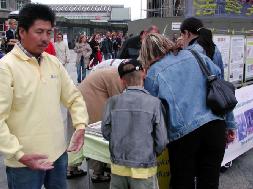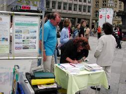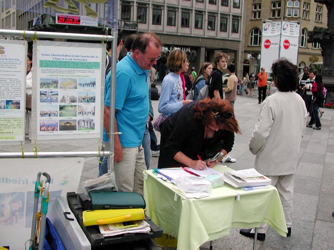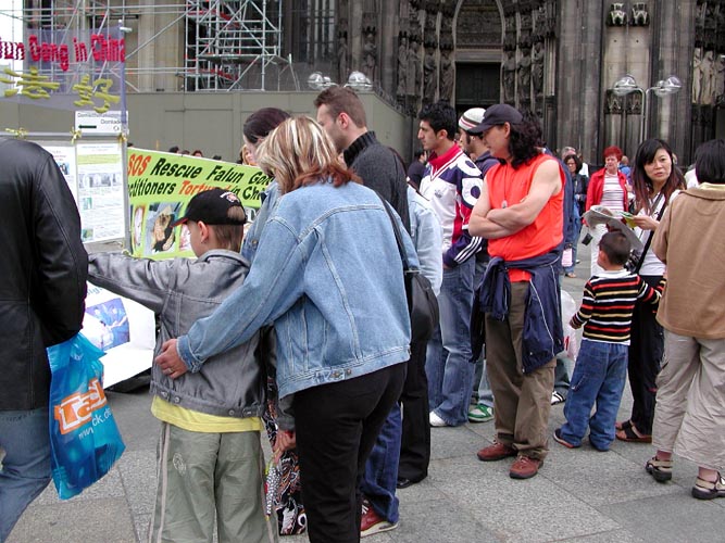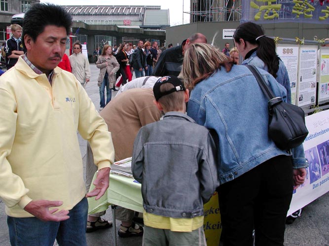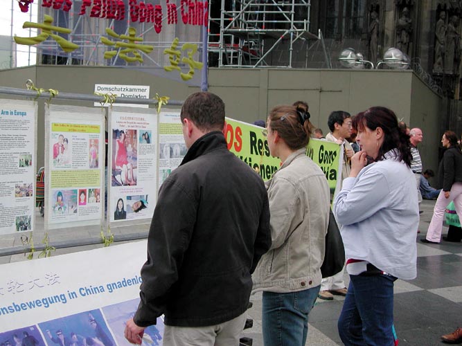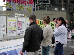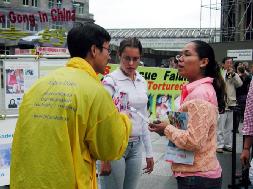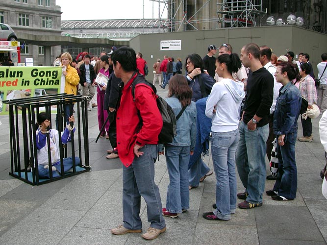 参加这次活动的有中、德等几国的学员,中国学员中有曾在国内受到迫害、遭到过非法监禁的;还有在了解真象后,毅然走进修炼的新学员。学员们配合着真象展板和酷刑演示,穿插在世界各地来的游客中,和平理性的向人们尤其是可贵的中国同胞讲真象,以事实揭露中共对法轮功的迫害,揭穿谎言,呼吁每一个有良知善念的人的支持,以使这场邪恶的迫害尽快结束。