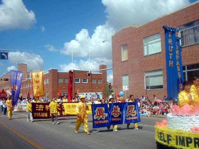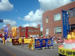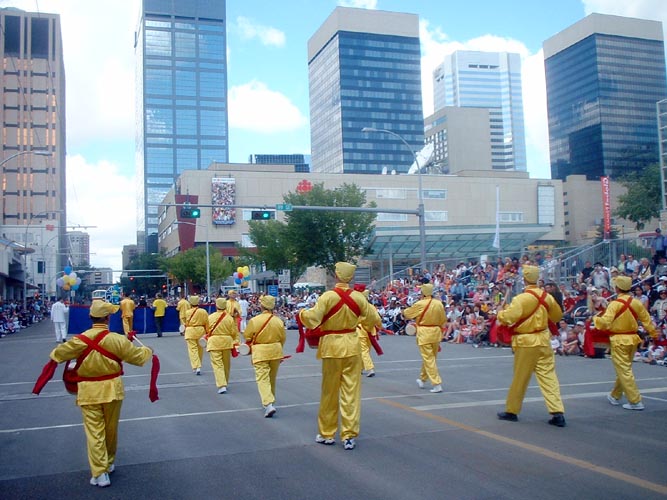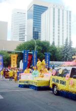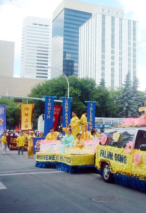 淘金节游行是埃德蒙顿市每年最大的游行庆祝活动,吸引了超过20万的观众现场观看游行,并同时有约300万电视观众收看游行实况转播。今年是法轮功学员连续第二年参加该项游行。大法学员的花车以扬帆的法船为设计理念,持莲飞天前方引导,在普度的悠扬乐声中,法船之上朵朵清莲,鼓起了“真善忍”返本归真的三道风帆。而在花车前面是威武的腰鼓阵开道,而后方则是巨幅“法轮大法”旌旗压阵。