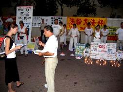 今天天气非常热,但学员们仍站在街口的多个角落里炼功,向行人讲真象,发传单(这张传单是我们为今天的活动特制的,但是仍沿用以往传单的格式)。