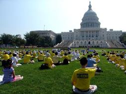 中午时分,酷暑逼人,看到一位在烈日下演示受酷刑的老学员,汗水不断的流,仍坚持在酷刑架上,她说:比起在大陆那些受到迫害的学员,这已经不算什么。