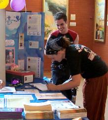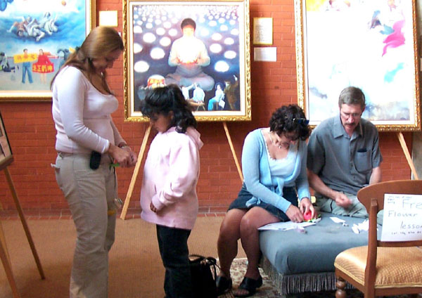 画展期间,有许多有缘之士当场学习功法。还有的参观者看到法轮功学员所分发的纸莲花后,留下来专心致志的学习折纸莲花。