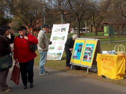 维多利亚广场位于市中区公路铁路交通枢纽中心,很多人在这里转换交通工具。广场四周从早到晚车水马龙。地处南半球的阿德雷得冬季绿草如茵,广场上,写有“和平请愿反对迫害6周年”、“法轮大法洪传世界”的横幅格外醒目,法轮功学员在悠扬的音乐声中静静的炼功,周边摆放着揭露迫害的真象图板。人们被眼前祥和的炼功场面所吸引,被图板上揭示的迫害罪行所震惊,纷纷停下脚步,仔细阅读,并在呼吁停止迫害的征签表上签名,也有的人径直走过去询问在哪里签名,显然是已经了解了真象,心中很清楚要做什么。