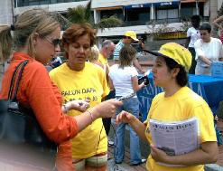 学员们向过往行人们发放法轮功真象传单和光盘,讲述法轮大法的美好以及在中国已持续6年的对法轮功及其修炼者的残酷迫害。人们纷纷签字支持法轮功学员,呼吁停止酷刑、停止迫害。