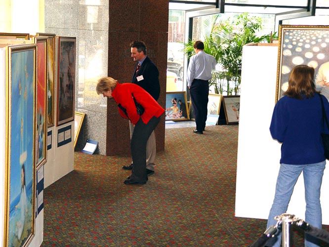 位于市中心的电讯大楼大厅是个人流比较大的地方,画展吸引了众多的参观者,人们上班前,午餐时间,下班后,甚至在楼外等车的时候都会進到大楼里看看画展。这个展厅是由大楼的负责人免费提供的。很多在市区和郊区的人接到有关画展的传单。这幢大楼里的各公司经理们都收到了带有莲花的精美的邀请函,他们对画展非常支持。一家印刷公司非常想支持画展,为画展提供免费印刷传单。