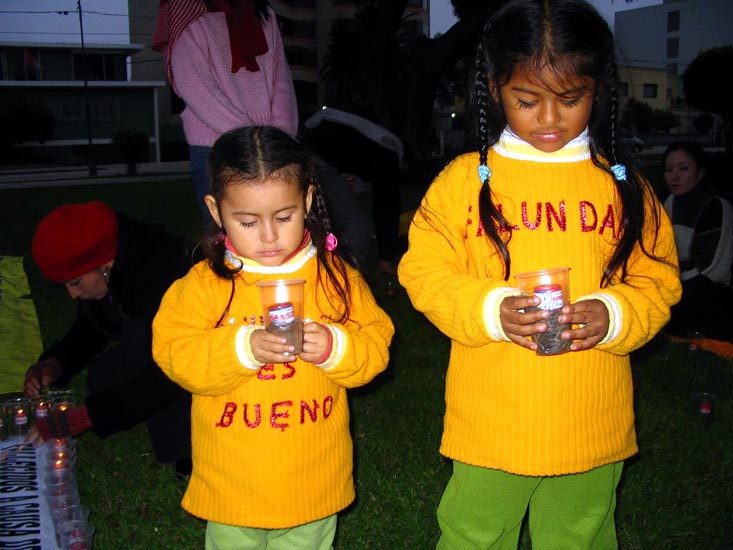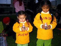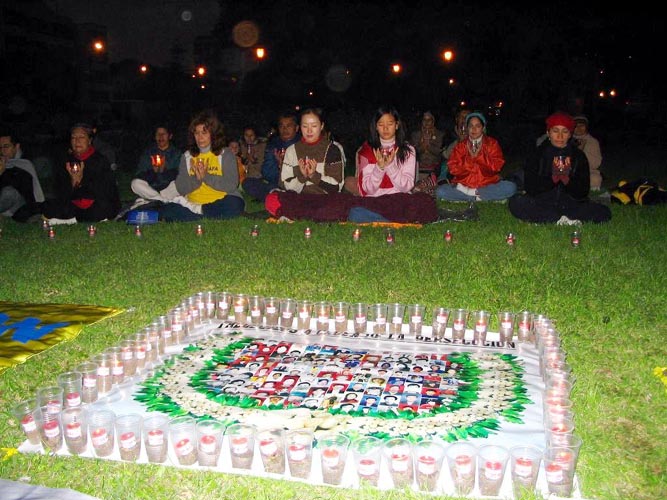 活动开始,向被中共迫害致死的同修默哀三分钟后,学员举起蜡烛寄托哀思。烛光闪烁,“普度”的音乐声在一片寂静中回响着。人们从横幅和图片上看到了学员们所做的和所要说的一切:“停止迫害法轮功”,“严惩江泽民”,“营救受迫害的法轮功学员”,“真、善、忍”。