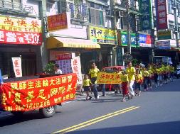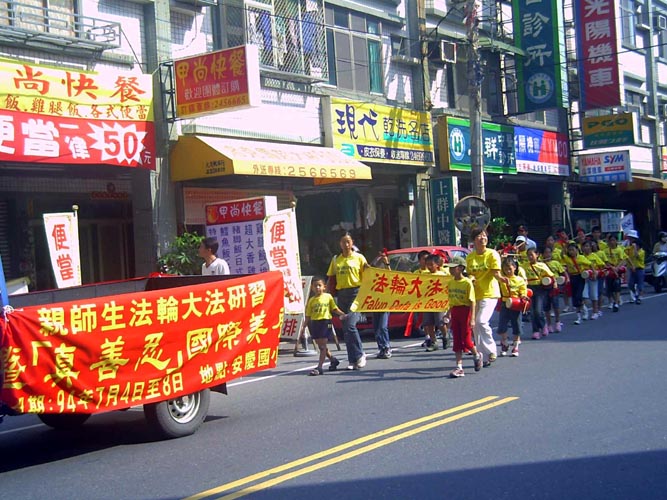 台南县市2005年度“亲师生法轮大法研习”于7月4日到7月9日在台南市安庆国小举行,并同时展出“真善忍国际美展”里多幅画作。为了让更多民众知道这次研习及美展活动讯息,台南明慧小弟子组成游行队伍,有的打腰鼓,有的发资料,沿着街道行走,并伴随着“法轮大法好”的音乐歌声,整个场面真诚祥和。