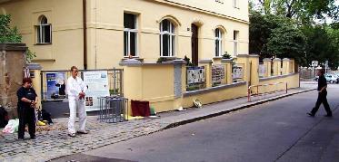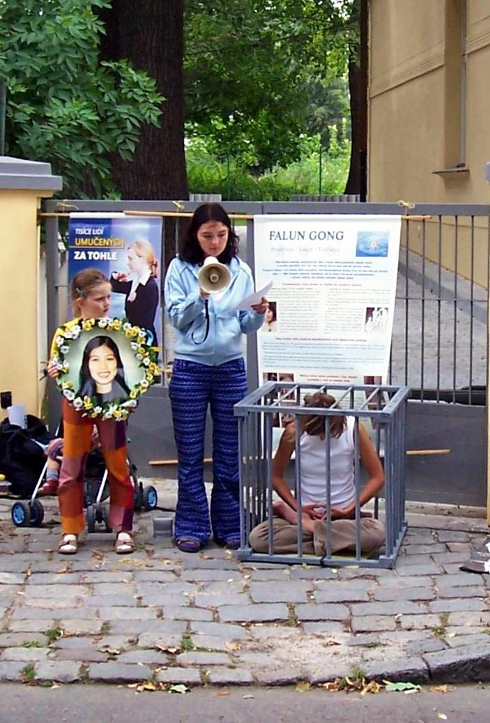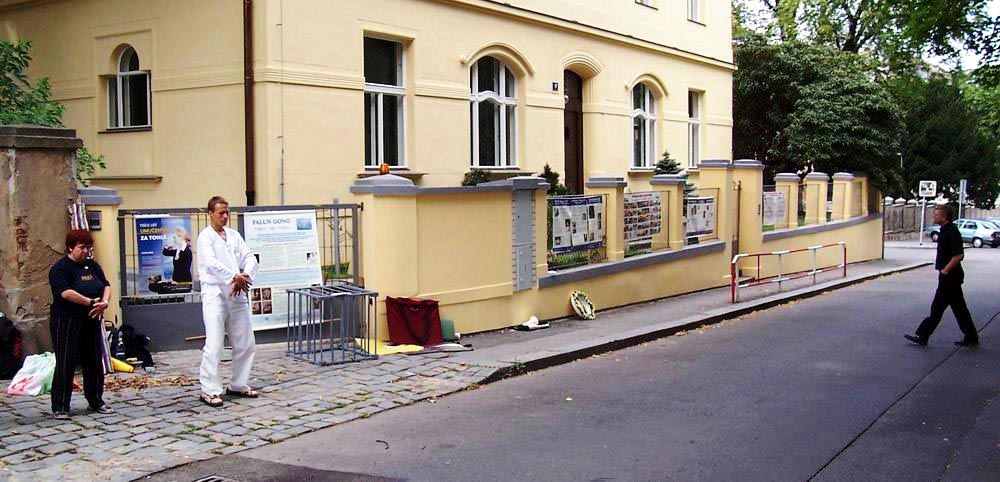 2005年7月20日中午12点到晚上11点,捷克部份法轮功学员在中领馆前谴责对法轮功的迫害,向民众和媒体揭露真象。