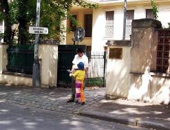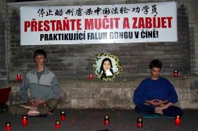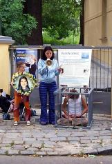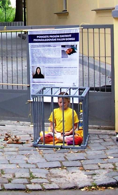 中领馆对面新装修的别墅里的住户首先了解了迫害真象,于是很愉快的提供别墅的护墙栏给学员挂真象资料。在挂真象横幅的过程中,捷克电视台的摄像师也来了,并说“媒体来支持你们了!”他拍摄了反酷刑展的图片和学员的打坐。