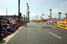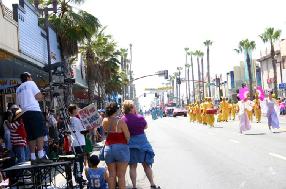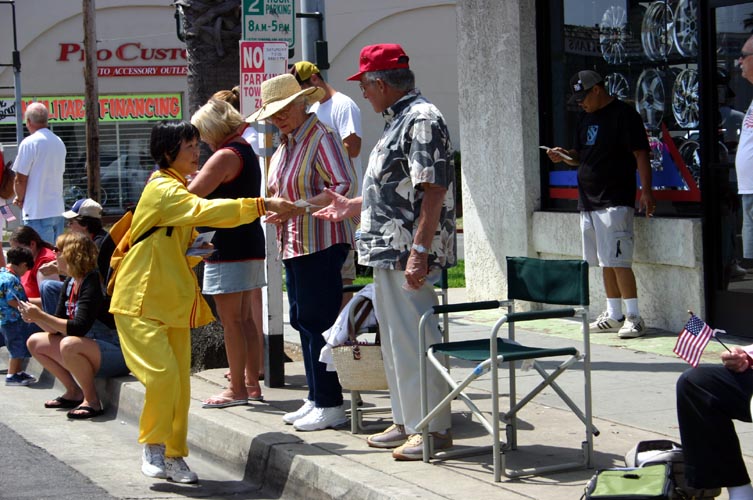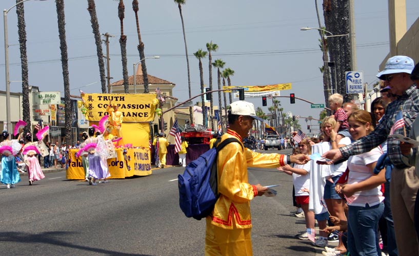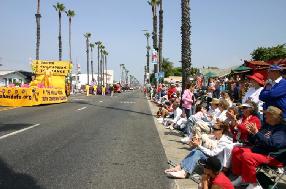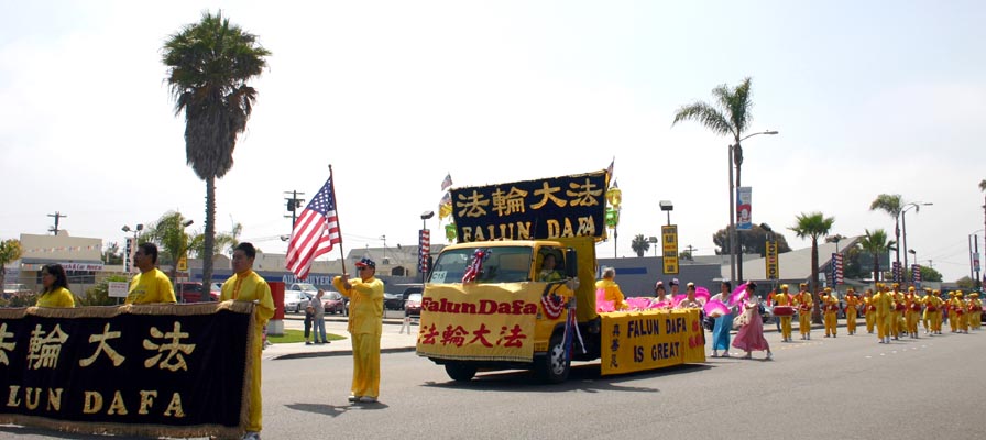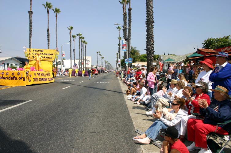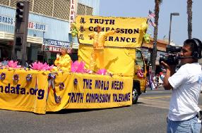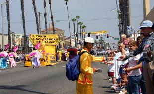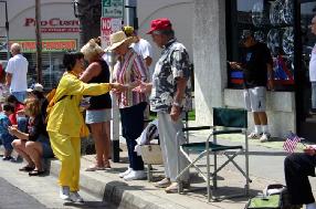 【明慧网2005年7月5日】7月2日上午,圣地亚哥法轮功学员参加了在北部海边市(Oceanside)举行的独立日游行。游行队伍包括大型“法轮大法”横幅、装饰精美的花车、优美典雅的扇子舞和英姿焕发的腰鼓队。游行过程中,花车上的学员不断演示功法,向人们展示大法的祥和美好;表演扇子舞和腰鼓的学员则不辞辛劳,一路不断的进行表演。