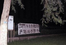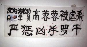 ![]() 长近3米、高近1米的横幅 | ![]() 挂在吉林市中级法院铁栏杆上的横幅 |