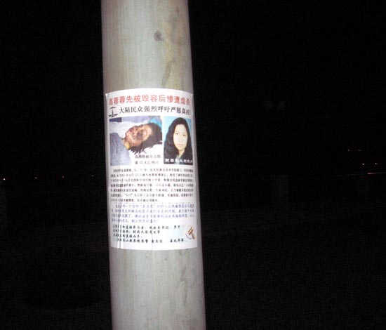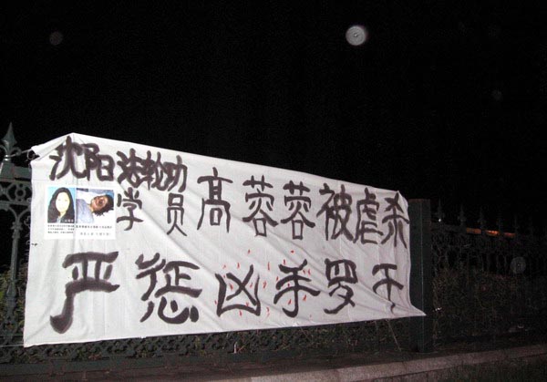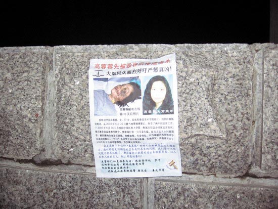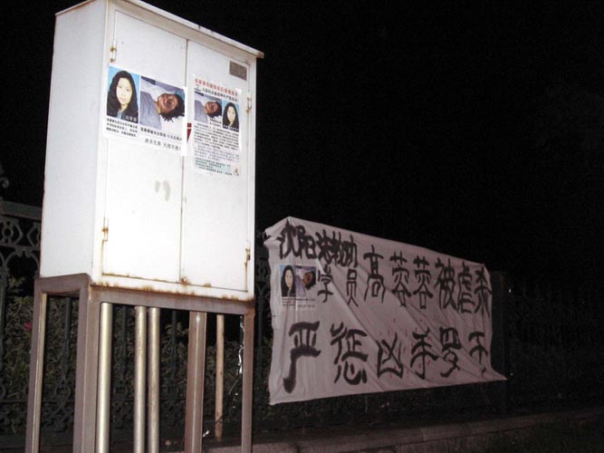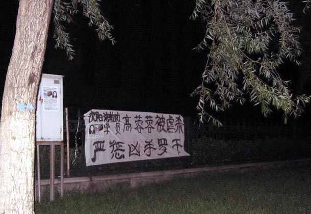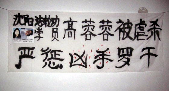 2005年7月1日晚,在中国大陆吉林市中级人民法院门前的铁栏杆上,出现了一条长近3米、高近1米的横幅。上写:沈阳法轮功学员高蓉蓉被虐杀,严惩凶手罗干,并在横幅的左上角贴有高蓉蓉被电击毁容后和生前生活照对比的照片。在中级人民法院的审判法庭的门前石壁上、法院周围的墙壁上、有派出所标志的路灯杆上贴有10多张彩色不干胶,上面写的内容是:高蓉蓉先被毁容后惨遭虐杀、大陆民众强烈呼吁严惩真凶!在不干胶上主要揭露了高蓉蓉在被非法监禁和劳教中,曾被毒打致一只耳朵失聪,被电击近7小时致毁容。被折磨的全身器官衰竭、骨瘦如柴,生命垂危。在当地被其他法轮功学员成功营救后,“610”头目罗干亲自指令抓捕,实施报复。高蓉蓉不幸于2005年3月再次被绑架,直至被迫害致死。最后还呼吁中国大陆民众:我们每个大陆同胞不能再沉默了,这样一个信仰“真善忍”的好人公然被毁容后又遭虐杀,面对邪恶无所顾忌的虐杀我们善良的同胞,我们都应该毫不犹豫的站出来抵制邪恶。以人类和人性的名义,制止邪恶的暴行!