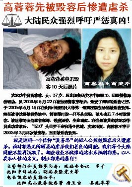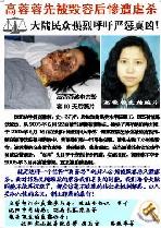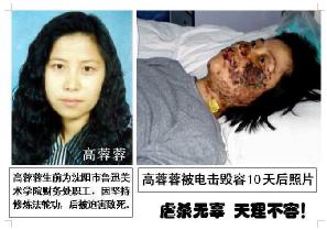 得知这一消息后我们深感震惊,在高蓉蓉遭电击毁容的恶性事件在全世界曝光后,中共恶党竟然不顾国际社会舆论和广大中国民众的正义呼声,一意孤行非但不悔过、收敛,反而恼羞成怒,并将迫害手段变得更隐蔽、下流,在国内国外民众都瞩目的情况下,公然将高蓉蓉虐杀。