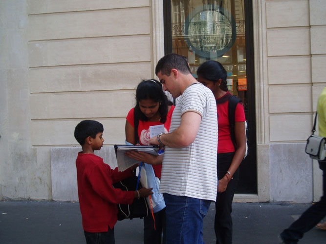 而此时的巡回洪法讲真象项目也正好按原定计划進行到了这里。2005年7月2日,巴黎法轮功学员们将真象横幅和展板放在了趁周末前来购物的人潮之中。
