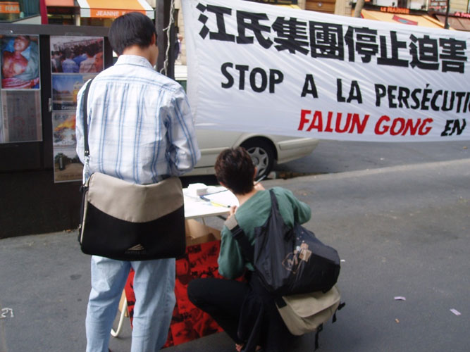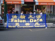 法轮功学员们还碰到了一个在北京居住过一年的法国人,因为受中共一言堂宣传谎言欺骗的影响,他面带疑惑的询问法轮功是否是×教。针对这种情况,学员向其详细的讲述了镇压前大法洪传中国以及四·二五、七·二零事件的始末。大量的事实真象和大法弟子的耐心解释终于使他明白了过来。临走前,他表示很高兴知道了这些真实情况,并问道∶“用中文怎么说‘Bonne continuation’(继续努力)?”