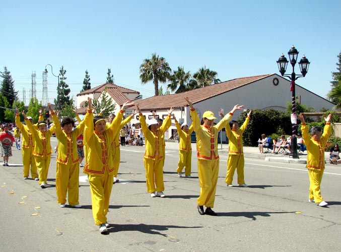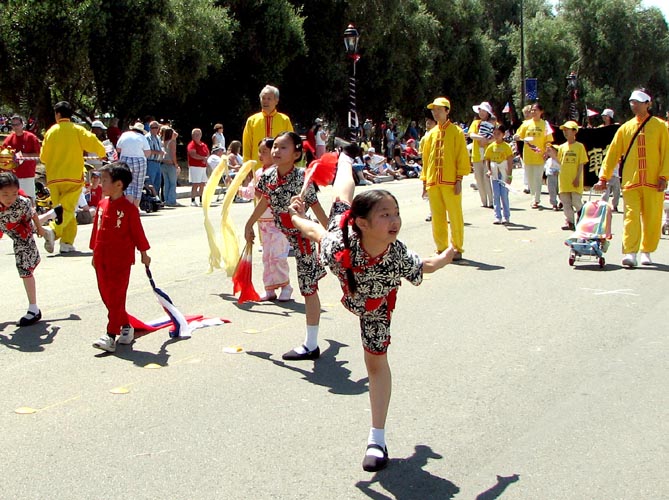 当天,明慧学校的小弟子们跳起了欢快活泼的小飞天舞蹈,他们为了这次的游行进行了紧张的排练。来自湾区各地的学员表演了生龙活虎的舞龙,他们不停的在整个法轮功的队伍中穿插表演,受到了观众热情的掌声。学员们还为观众带来了必不可少的法轮功功法,为现场带来了祥和的气氛。