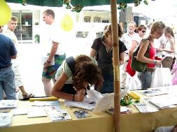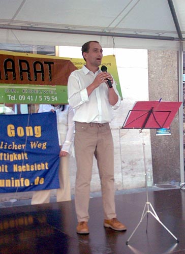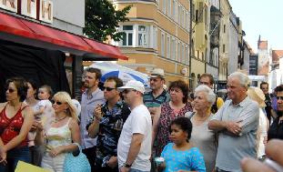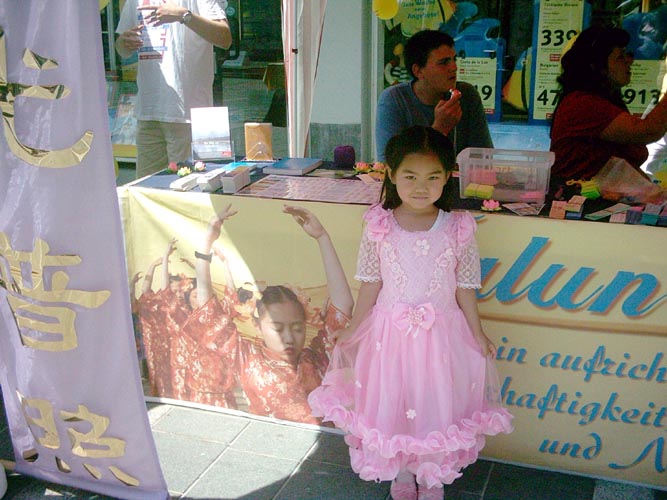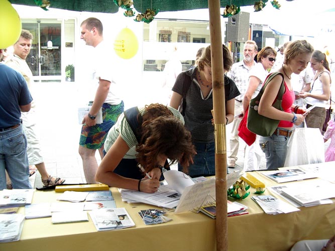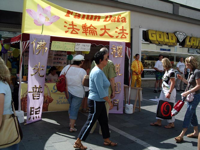 【明慧网2005年7月6日】2005年6月底的周末,德国南部的中型城市雷根斯堡迎来了两年一度的市民节。热火朝天的节日里,雷根斯堡的步行街上异常喧嚣,而广大的民众又一次见证了法轮功这块人间净土的美好与祥和。