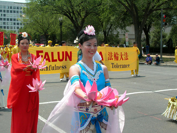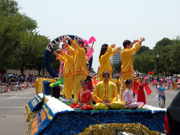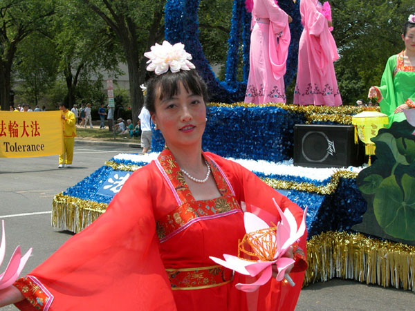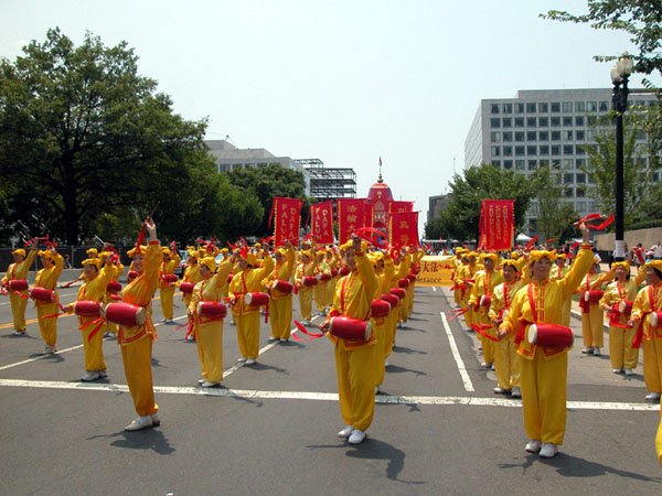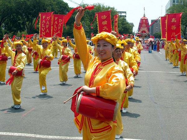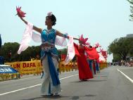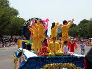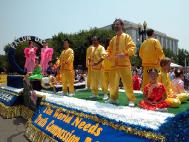 法轮功学员的游行队伍由炼功花车、仙女舞队、腰鼓队和旌旗组成。