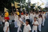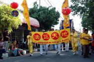 ![]() “法正天地”横幅 | ![]() 会读《转法轮》的盲人学校学生参与法轮功游行 | ![]() 法轮功团体被评为最出色的队伍,荣获优异奖章和奖杯 |