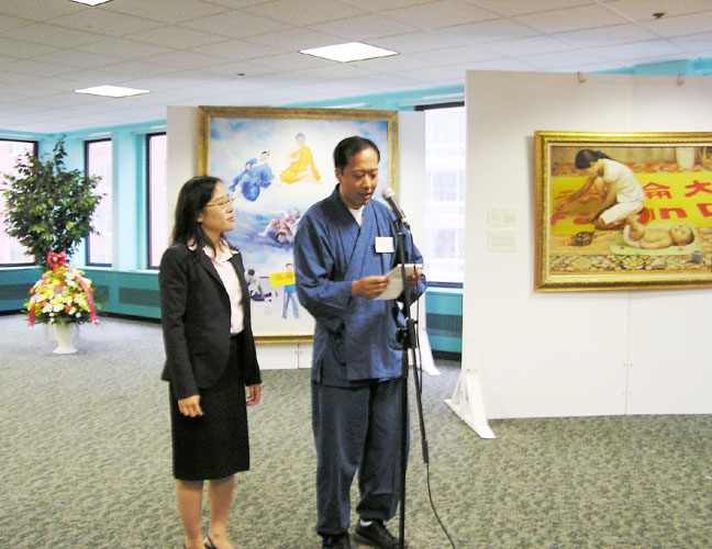 画家张昆仑教授和来自日本的李圆代表了画家们致词。张教授表达了对展出单位的感谢,指出所有的灵感都来自画家修炼的亲身体验和中国大陆发生的残酷迫害,绘画作品表达了艺术家们对神佛的敬仰和礼赞,亲身修炼所经历的美好境界,以及修炼人面对残酷迫害大善大忍坚忍不拔的精神。张教授提到自己在大陆四次被关押,被打,被电击,被洗脑的真实经历。画家李圆表达了作为法轮大法艺术中心的成员,他们希望重新找回古老的正统的绘画技术和绘画表达的内涵,希望赋予古老的艺术崭新的生命。