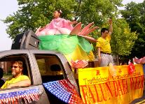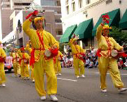 “法轮大法真善忍”横幅 |  阿普阿林顿市游行中的法轮功腰鼓阵 |  在花车上的展示法轮功功法 |