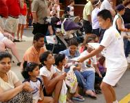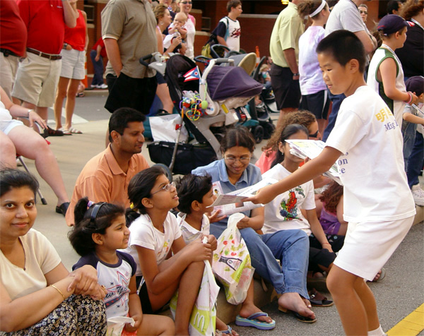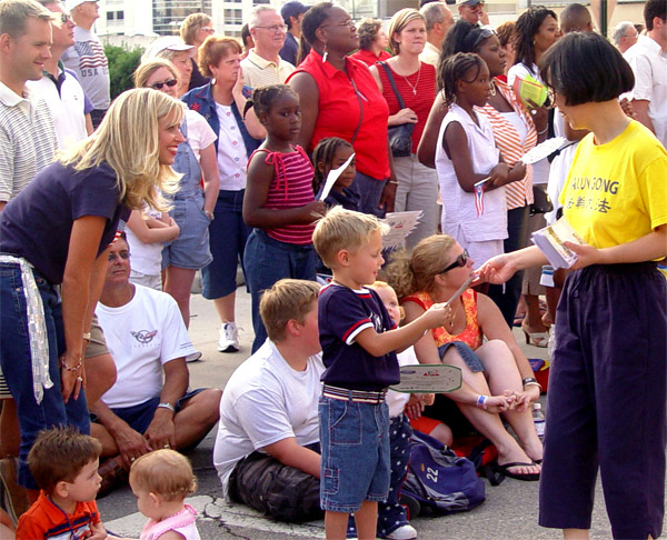 哥伦布市游行中的法轮功腰鼓阵 |  小观众:“我也要一个(洪法书签)。” |  小弟子在发真象资料 |