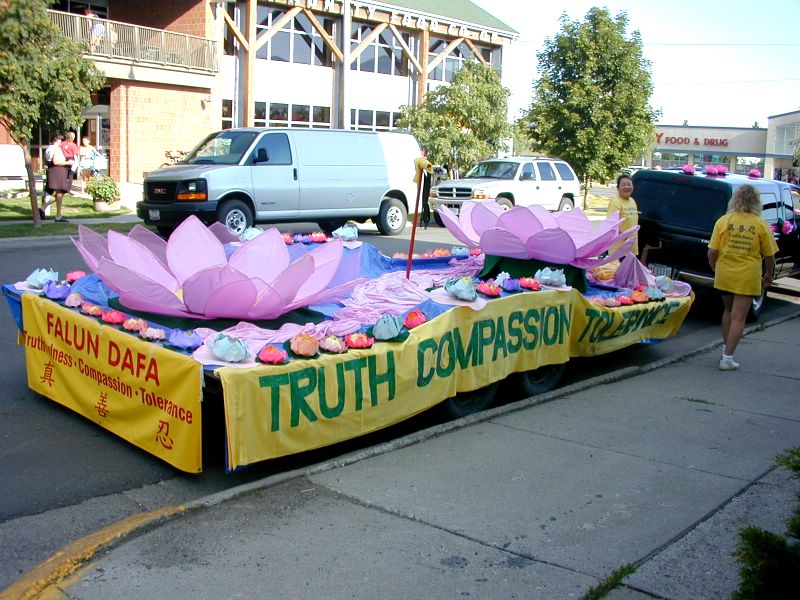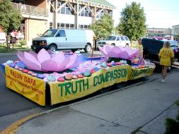 本次游行的主题是“花卉”,法轮功学员的游船赢得了“最佳使用花卉”类别的第一名。来自蒙大拿、华盛顿和犹他州的法轮功学员共同制作了一部美丽的彩车。我们在彩车的前面贴上了一面法轮大法横幅,彩车的两侧是“真善忍”横幅。在法轮功学员展示第五套功法的地方,我们摆放了两朵巨大的莲花,另一位学员在展示动功。